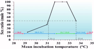 Figure 1 – Mean incubation temperature and the resulting sex of Crocodylus acutus‘ offspring [3].