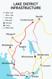 Hard infrastructure is classes as roads, bridges and power grids, this can be found all over the district with many roads leading to different towns and attractions within the north west of England. There are also many different bridges that are consisted of old bricks and stone which are now called the boundary walls. The locals take their own time to preserve the walls and ensure that nothing happens to the wall. Above is an image that was generated by Microsoft Co-pilot which is the main and used hard infrastructure within the Lake District. This maps out the main towns within the region.
