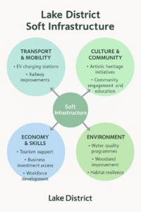 Soft infrastructure includes social and economic services such as healthcare, education and financial systems. The Lake District is not just for tourists there are residents in each town so they will need local assistance such as health care and education services.