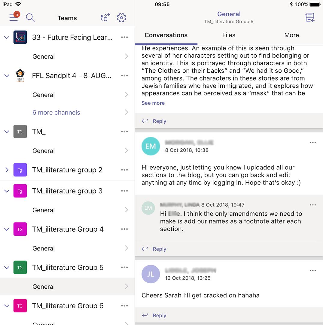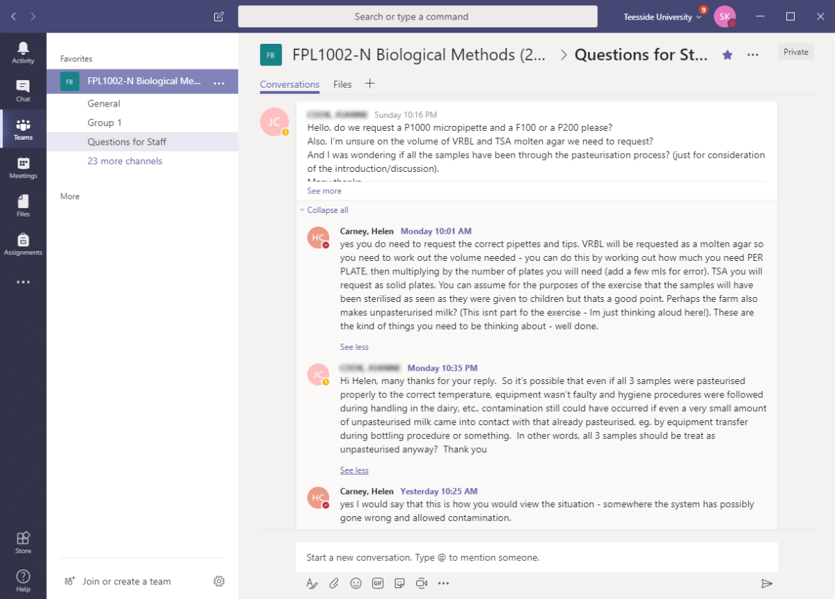 The general channel and conversation tab was used for ice breaker activities and for sharing useful resources amongst the cohort. A separate channel for asking questions to staff was also created and was actively used by the students.