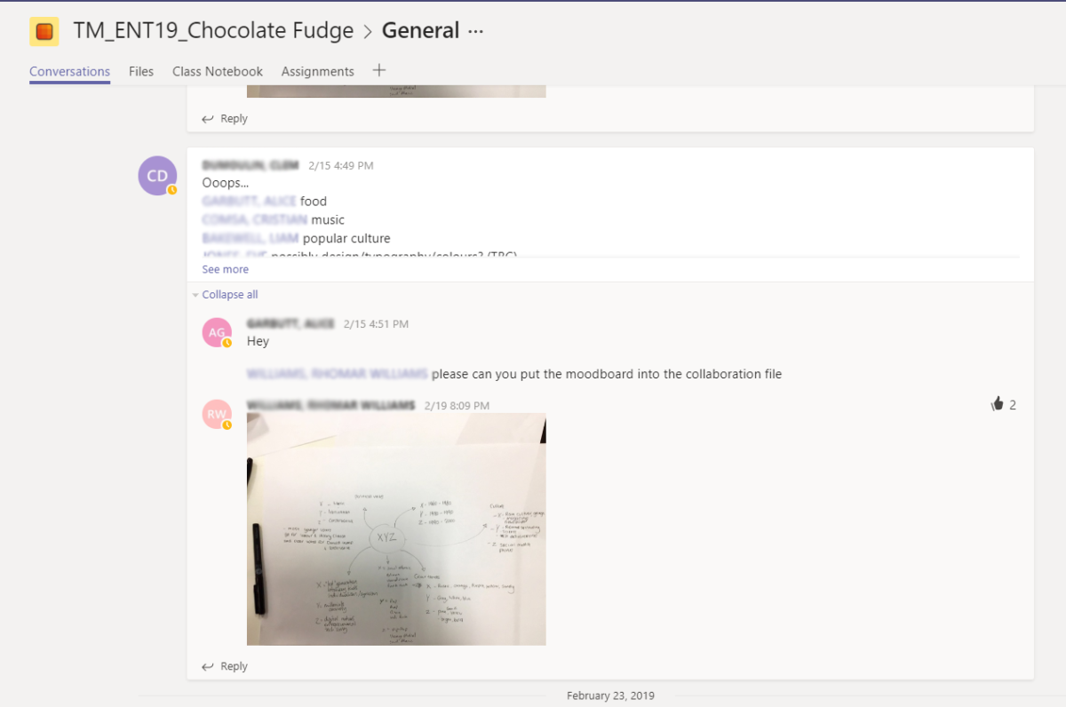 Charles Tait and Michael Hall (Design) used Teams to get their students thinking about how to keep information regarding a particular project. In this example, it was developing a marketing strategy for a chocolate cake. Whilst the students used a face-to-face approach, they made great use of the team to keep a record of the day’s activities.