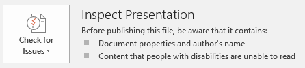 The presentation will now be inspected for potential issues and the results shown in the right side pane.