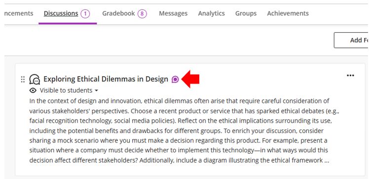 Staff who use discussions in their Blackboard module will see an indicator in the module tools menu showing whether they have any discussions with unread posts. The indicator will display the number of discussions with new/unread posts, not the total number of new/unread posts in the discussions.