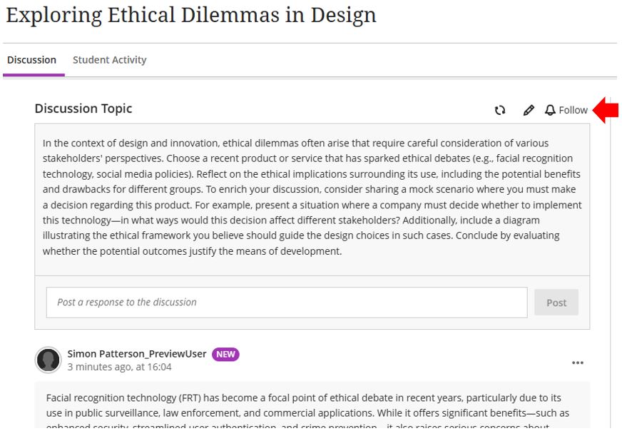 Both Teesside University staff and students can also keep track of discussions by accessing the discussion and using the ‘Follow’ option. This will send notifications via email of posts and replies to a discussion.