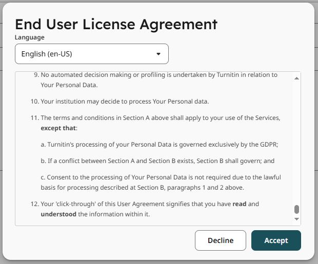 *Please note that the first time you access the new Turnitin Feedback Studio Experience, you will be prompted to agree to the new terms and conditions. You will need to scroll down to the bottom of this agreement before being able to accept and close the pop-up.