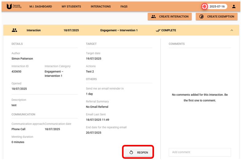 The original creator of a student interaction can now reopen it, even after marking it “Completed”. They can update or delete the interaction if necessary. This feature is exclusive to the person who created the interaction.