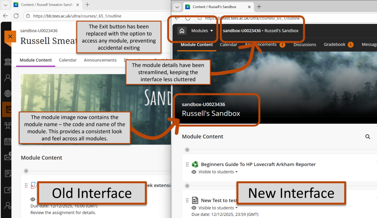 Before we explore the new module layout, it’s worth pointing out that the side menu now displays the users profile picture (if they have uploaded one). There’s also space between the standard menu items (such as Modules and Organisations) and the option to Sign Out of Blackboard, providing a clear distinction between these two areas.